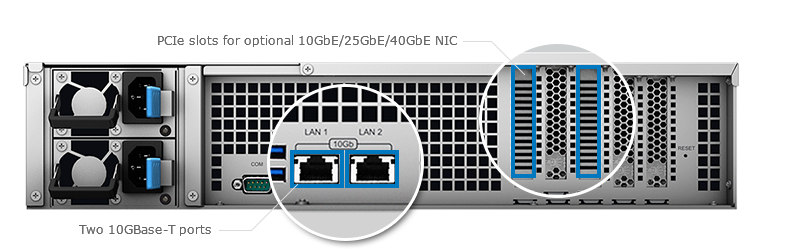 FS3017 內(nèi)建雙 10GBase-T 網(wǎng)絡(luò)端口。當(dāng)你需要更多的帶寬時,可透過兩個 PCIe 插槽新增額外的網(wǎng)絡(luò)控制器,也可選擇 10GbE、25GbE 與 40GbE 網(wǎng)絡(luò)適配器以發(fā)揮 FS3017 的效能。此外,通過額外購買 FS3017 支持的網(wǎng)絡(luò)適配器,iSCSI over RDMA 技術(shù)更可進(jìn)一步強化約 80% 的 iSCSI 效能。
