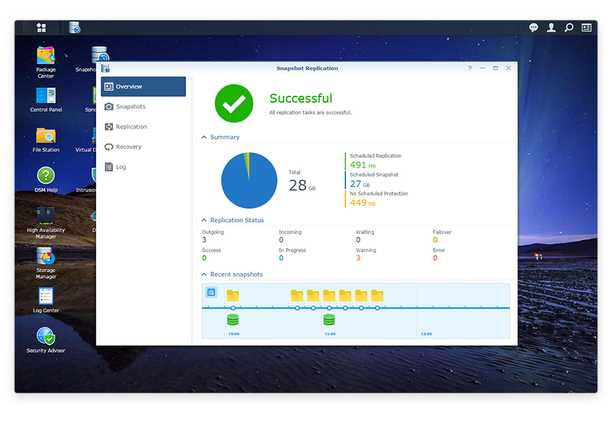 FS3017 內(nèi)建可拍攝高達(dá) 65,000 張備份快照并抄寫至異地服務(wù)器的 Snapshot Replication 套件,帶來高速的數(shù)據(jù)保護,并確保共享文件夾中的數(shù)據(jù)或 iSCSI LUN 中的虛擬機即便遇上災(zāi)難事件也能十分安全。