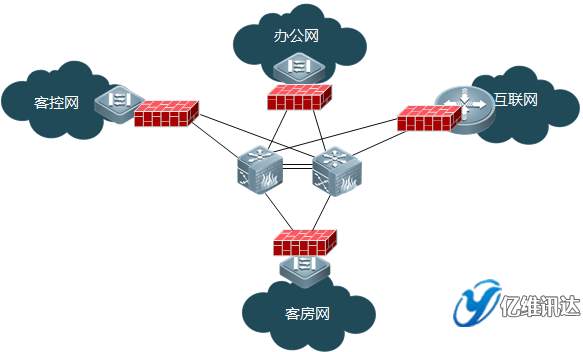 通過銳捷核心交換機的防火墻模塊的虛擬防火墻功能,對客控網、客房網、辦公網進行安全防護,將病毒/攻擊隔離在本地,不影響其他區(qū)塊正常運行。