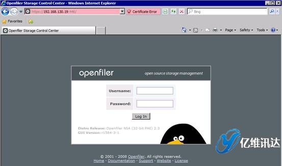 Openfiler 鏡像系統(tǒng)配置當 Openfiler 系統(tǒng)安裝并重啟完成后,對系統(tǒng)所有后續(xù)的配置過程,都是以 Web 方式配置完成的。這種全部基于 Web 的系統(tǒng)配置方式,使得配置過程變得更加簡易,同時也帶來了良好的用戶體驗。首先打開瀏覽器,輸入地址:https://IP:446。注意,此處輸入的 IP 地址為在系統(tǒng)安裝時所配置的固定 IP 地址。然后使用系統(tǒng)初始默認的用戶名和密碼進行登陸。用戶名為 openfiler,密碼為 password。系統(tǒng)初始的用戶名和密碼可以在第一次登入系統(tǒng)后進行重新設置。如圖所示。