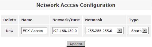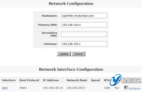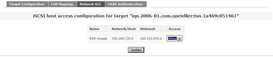 在系統(tǒng)菜單“System”菜單下的“Network Access Configuration”區(qū)域,配置允許訪問 Openfiler 系統(tǒng)的安全訪問控制列表。值得注意的是只有加入到 Openfiler 的網絡訪問控制列表中的網絡或者主機地址,才允許訪問 Openfiler 系統(tǒng)所提供的虛擬存儲服務。在網絡訪問控制列表中,既可以配置網段地址也可以配置單個主機地址。在本例填入 192.168.130.0 網段,設置類型為“Share”方式,添加完成后點擊“Update”完成系統(tǒng)配置更新。如圖