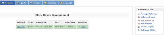 當配置好系統(tǒng)的安全訪問控制后,接下來的一步是配置系統(tǒng)磁盤,實現虛擬存儲服務。在 Openfiler 中,有三類存儲概念:Block Device,Physical Volume 和 Volume Group。其中,Block Device 表示的是實際的物理磁盤;Physical Volume 表示的是物理磁盤的分區(qū),它是組成 Volume Group 的單元;Volume Group 則是由一個或多個物理磁盤分區(qū)(Physical Volume)組成,它又是組成 Logical Volume 的單元。