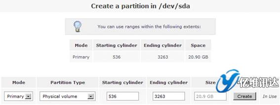 在這里,我們要創(chuàng)建一個新的分區(qū)。首先在“Create a partition in /dev/sda”處設置“Partition Type”屬性的值為“Physical volume”,在“Ending cylinder”屬性處選擇默認值,從而設置當前所有的剩余空間劃為一個分區(qū),最后點擊“Create”選項。如圖