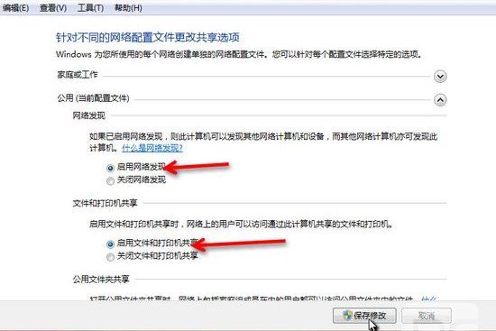 選擇 公共網絡---選擇以下選項:啟動網絡發(fā)現(xiàn)------啟動文件和打印機共享-----啟用共享以便可以訪問網絡的用戶可以讀取和寫入公用文件夾中的文件(可以不選)----關閉密碼保護共享( 注釋:其他選項默認即可!)