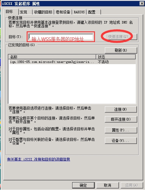 打開ISCSI 配置界面,在目標(biāo)中輸入WSS服務(wù)器的IP地址,然后點擊"快速連接",當(dāng)連接成功后完成后續(xù)配置。